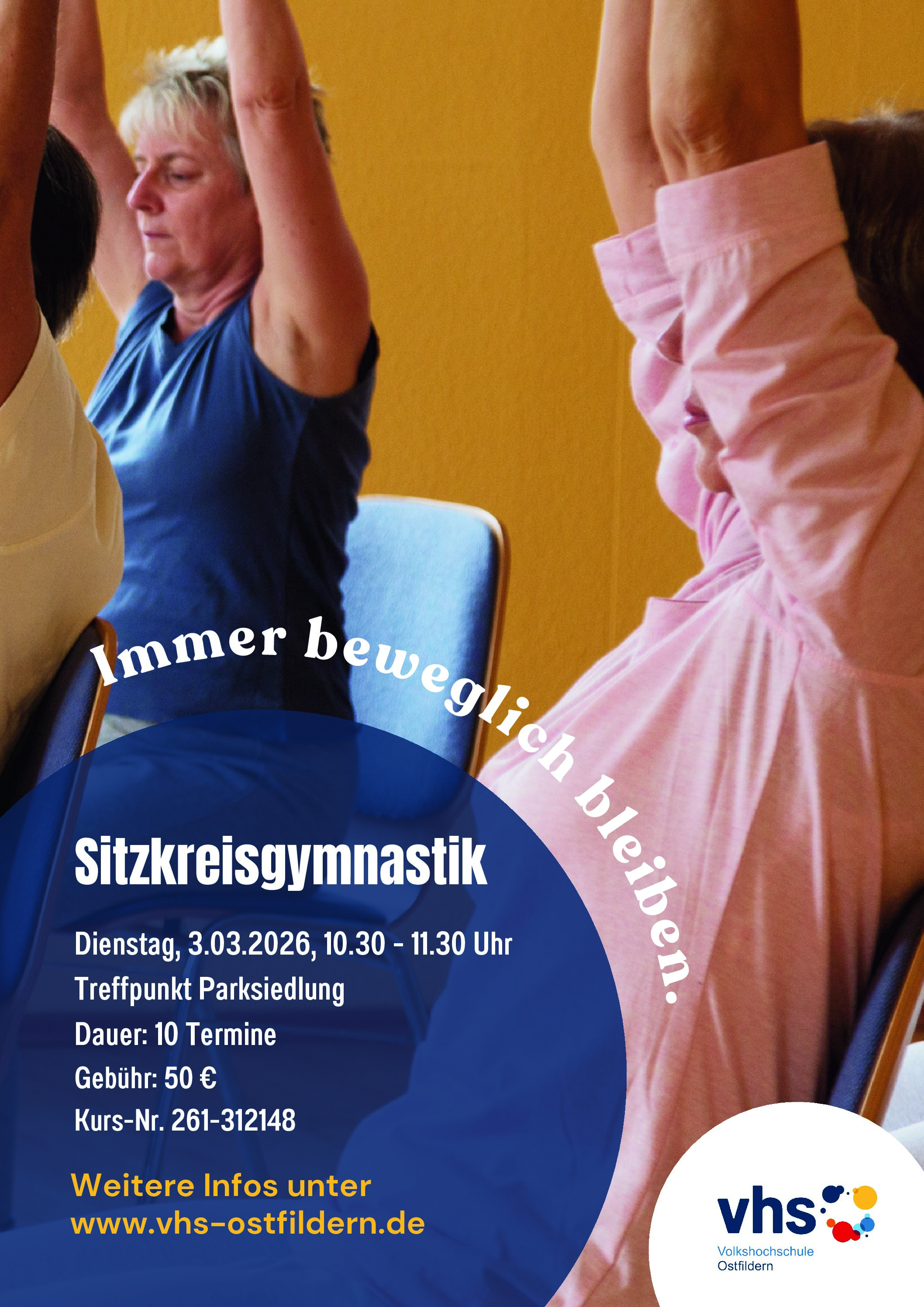 Am 03.03.26 startet der neue vhs-Kurs Sitzkreisgymnastik mit Bianca Barbosa. Bitte melden Sie sich direkt bei der vhs Ostfildern an. vhs, Esslinger Str. 26, 73760 Ostfildern, Volkshochschule Ostfildern, Tel.: 0711 3404-800, E-Mail: volkshochschule@ostfildern.de